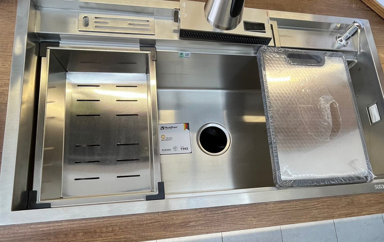 سینک سایز 90 باکسی تک لگن دو پله هوادیو با ضخامت ورق 2میل یک انتخاب حرفه ای و موندگاره .کاملا ضدخش و ضد اسیده و به خطر کف لانه زنبوری هم آب گریزه هم اجازه نمیده گچ و جرم روی سطحش بشینه . گوشه های کرو باعث شده تمیز کاریش راحت باشه . طراحی دوپله هم کارایی سینک رو بالا برده و امکان استفاده از اکسسوری هارو میده این سینک هم به صورت توکار و هم زیرکار قابل نصبه .